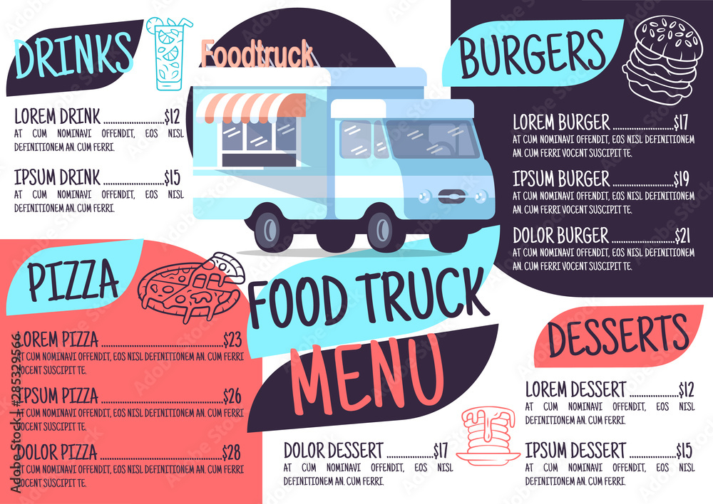 Food Truck Menu Template Print Design With Flat Icons Concept Vector Illustrations Restaurant Cafe Banner Flyer Brochure Page With Food Prices Layout Stock Vector Adobe Stock